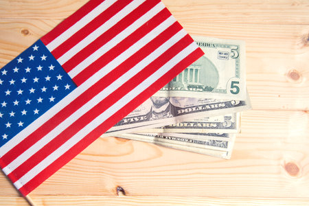 america flag and dollars on wooden background