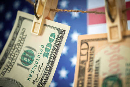 Money laundering with US dollars hung out to dry on American flag background. Dollar bills hanging on clothesline, close-up view photo