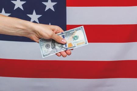 Hands holding dollar banknotes on the background of the flag of the United States of America
