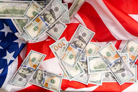 American dollars banknotes on the flag of United States of America. US dollars background. 100 USD