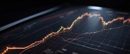 A close-up view of an interactive stock trading chart on a tablet, showing candlestick patterns and technical indicators in a well-lit environment.