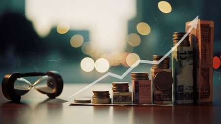 A close-up of various stacks of coins with a red upward arrow indicating growth, representing financial success and investment opportunities in the economy.