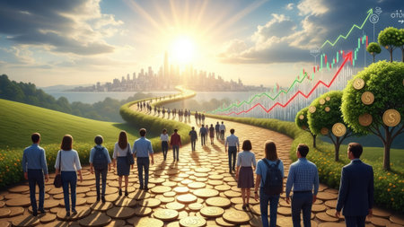 A group of people walks along a winding path towards a city skyline and a rising financial chart. The composition utilizes a warm color palette with green hills, a golden path, and bright sunlight. The image could be suitable for illustrating concepts of growth, success, and journey, for various commercial applications.