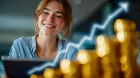 Happy businesswoman holding tablet with stacks of coins and growth chart, symbolizing financial success and career growth.