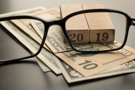 Glasses, number 2019 on the dollar banknotes background. Selective focus