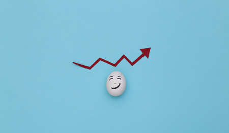 Level up. career. Egg with a drawn confident face and a red growth arrow on a blue background.