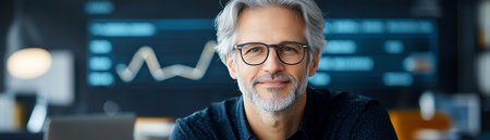 A confident businessman in glasses smiles at the camera in a modern office, surrounded by digital graphs and analytics, reflecting professionalism and success in a corporate environment.