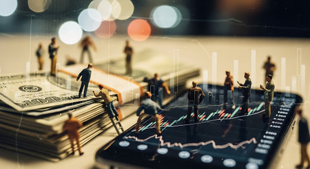 Tiny figurines of business people interacting on a stack of US dollars and a smartphone displaying financial graphs.