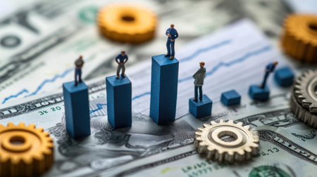 This image showcases miniature figures standing on stacked blocks, symbolizing financial growth and success, surrounded by money and gears, depicting economic dynamics.