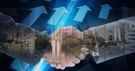 Business handshake on finance prosperity and money technology asset background . Economy and financial growth by investment in valuable stock market to gain wealth profit form currency trading