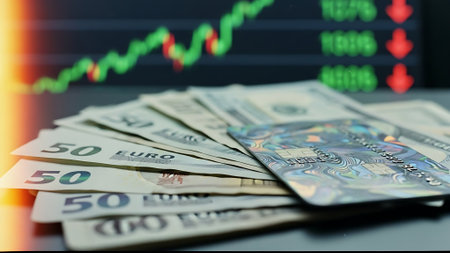 A stack of Euro banknotes with visible denominations on a wooden surface, with a black background featuring a yellow financial graph.