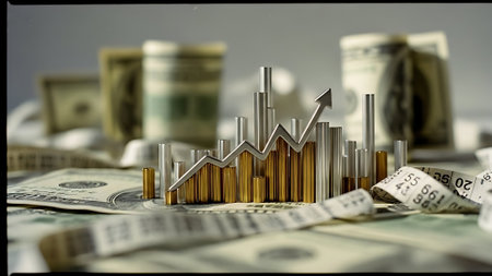 A laptop screen showcases financial data amidst piles of gold coins and currency notes. The composition employs a shallow depth of field, focusing on the laptop. The scene is illuminated by soft lighting, giving a luxurious, business-oriented atmosphere, suitable for illustrating investment strategies and economic concepts.