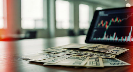 A pile of US dollar bills on a wooden table next to a laptop displaying a stock chart in a bright, modern office setting.