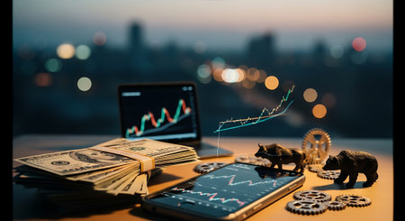 A cityscape at dusk with a laptop, tablet, cash, and bear and bull statues on a table.