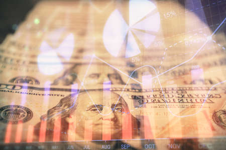 Double exposure of forex graph drawing over us dollars bill background. Concept of financial markets.