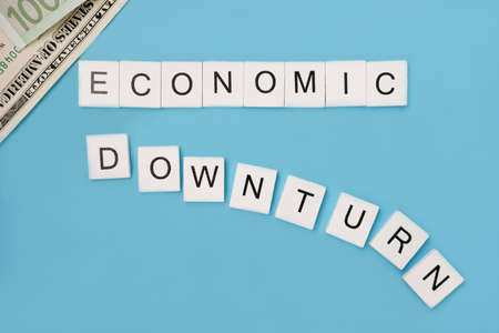 Phrase economic downturn spelled out in wooden letter tiles on trendy blue background. Economic and financial crisis concept. global economic recession. Top view. Flat lay