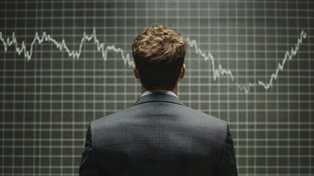 A businessman intensely focused, with a stock market graph reflected in the background, symbolizing financial market trends and corporate strategy.