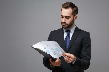 Successful young business man in classic black suit shirt tie posing isolated on grey background. Achievement career wealth business concept. Mock up copy space. Hold clipboard with papers document.
