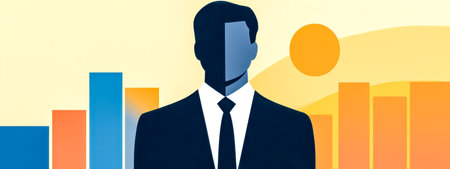 Professional senior executive stands confidently in a business suit, exuding warmth and positivity against a backdrop of financial growth graphs, symbolizing success.