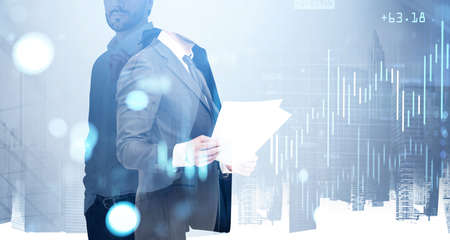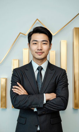 Confident businessman in suit with financial graphs in background