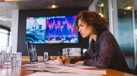 A focused business woman analyzes stock market data and financial charts in an office meeting, strategizing for investment success with her laptop.