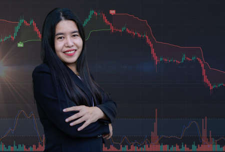 Confident businesswoman in black suit smiling with trading against stock market and candlestick graphic on background in Bear Market and trading indicators. Asian woman analyzed stock graph chart