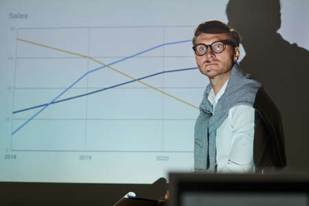 Serious handsome young financial specialist in eyeglasses wearing sweater around neck explaining sales graph at business seminar