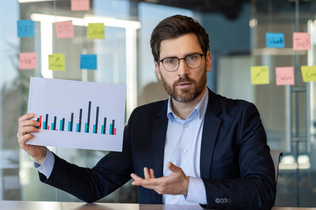 Confident businessman holding chart in office setting explaining data concepts during meeting with colleagues on video call.