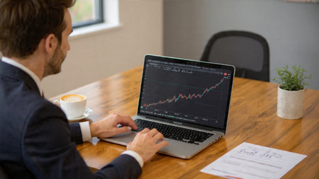 Serious businessman in suit and tie looks intently at a computer screen showing a stock market graph.