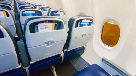 window of a commercial airliner with empty seats. Concept of air travel and vacation