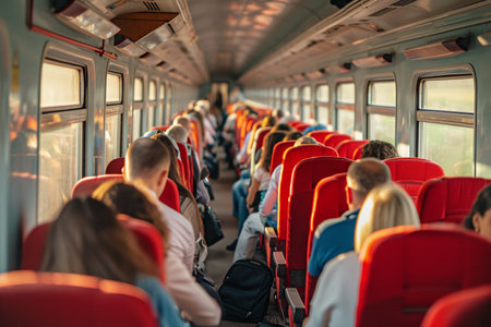 Group of people traveling by train. Passengers on the train.