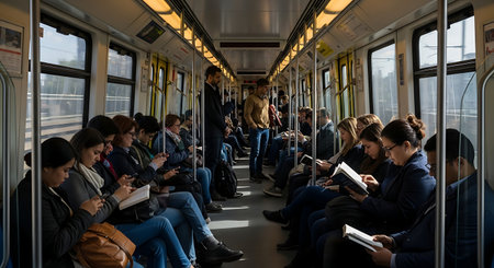 Inside a bustling subway train, commuters engrossed in phones and books.