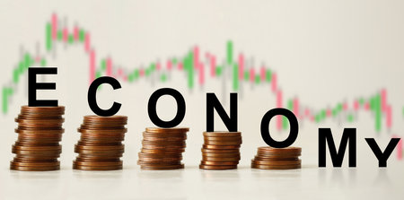 Global economic recession and crisis is shown by word Economy on decreasing coins stacks