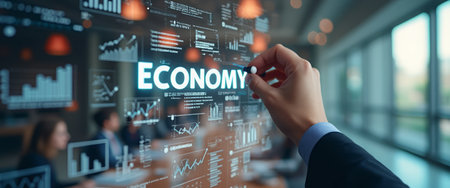 A focused hand is poised to write the word ECONOMY on a sleek digital display filled with vibrant graphs and data points. The background reveals a modern office setting, where professionals engage in discussions, highlighting the dynamic interplay between technology and economic analysis.