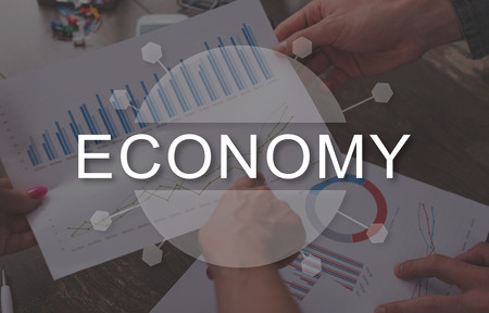 Picture of a person taking out money from his wallet. ECONOMY with an upward pointing arrow is written in background. Picture is depicting economic growth.