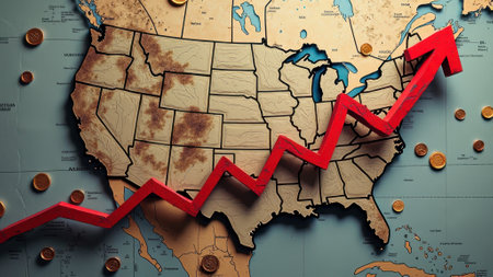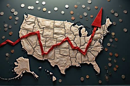 That the image is generated using AI. Map of united states with rising red arrow and scattered coins indicating economic growth.