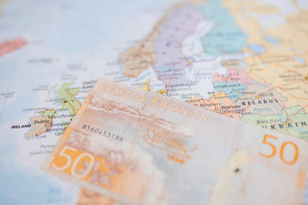 Sweden on a European Map with a Fifty Swedish Kronor Bill on Top