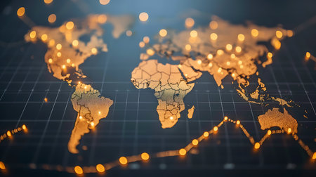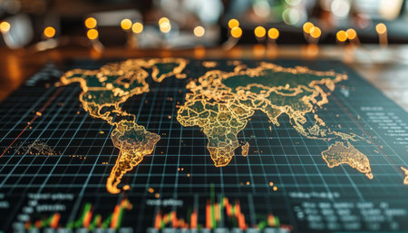This image showcases a world map intertwined with financial graphs and data, symbolizing the interconnectedness of global markets and economic trends.
