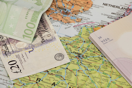 Map, euro and pounds money and a passport. Concept of Europe travel.