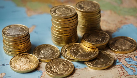 Several stacks of gleaming gold coins are strategically placed on a detailed map. The coins, with intricate visible on their surfaces, suggest international currency or investment. The map, with its continents and geographical markers, emphasizes the global scope of finance and trade. The lighting casts subtle shadows, adding depth and highlighting the texture of both the coins and the map. evokes themes of global commerce, international investment, and the interconnectedness of economies.