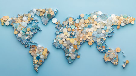 A world map is formed from assorted coins arranged meticulously to represent each continent, illustrating the beauty of global currency diversity against a calming blue backdrop.