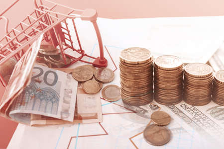 Russian rubles in a trolley on a light background. Grocery basket and Russian rubles. Russian currency. Selective focus.