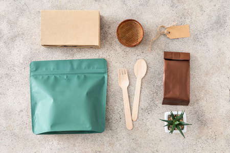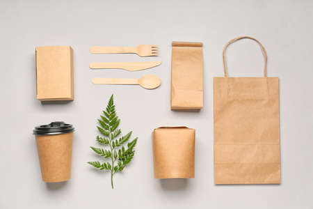 Catering and street fast food paper cups, plates, containers. Eco-friendly food packaging, wooden cutlery and paper eco bag on grey background. Zero waste and recycling concept.