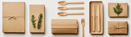 Eco-friendly packaging with wooden cutlery and natural decoration elements.