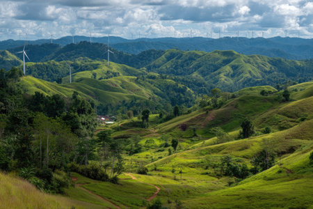 The image showcases a scenic landscape of green rolling hills, featuring several wind turbines. The composition includes varying shades of green, with sunlight creating depth and texture. The sky is filled with clouds. It could be suitable for environmental, energy, or travel-related publications.