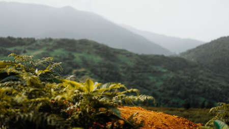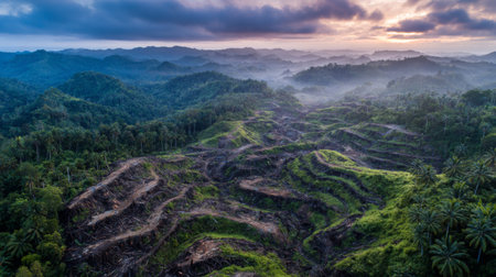 This captivating image depicts a serene sunrise over lush hills, showcasing a stark contrast between deforested land and surrounding greenery in a misty mountain landscape.