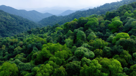 A stunning view of a vibrant green forest landscape featuring dense foliage, rolling hills, and misty skies, perfect for nature enthusiasts and outdoor adventures.