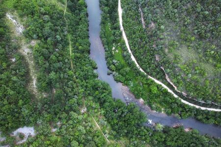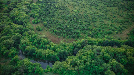 River in the wild. Aerial view of small river in middle of green forest in the wildlife. Natural Resource and Ecosystem. Wildlife Refuge Wetland Restoration. European Green Nature Scenery.