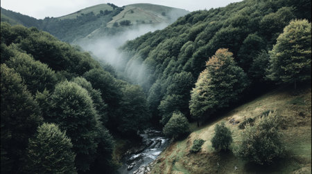 Serene landscape featuring a foggy valley with dense green trees, hints of autumn colors, a flowing river, and surrounding misty hills.