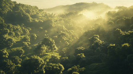 Experience the serene beauty of a lush green forest bathed in soft morning light, highlighting the tranquil hills and vibrant foliage.